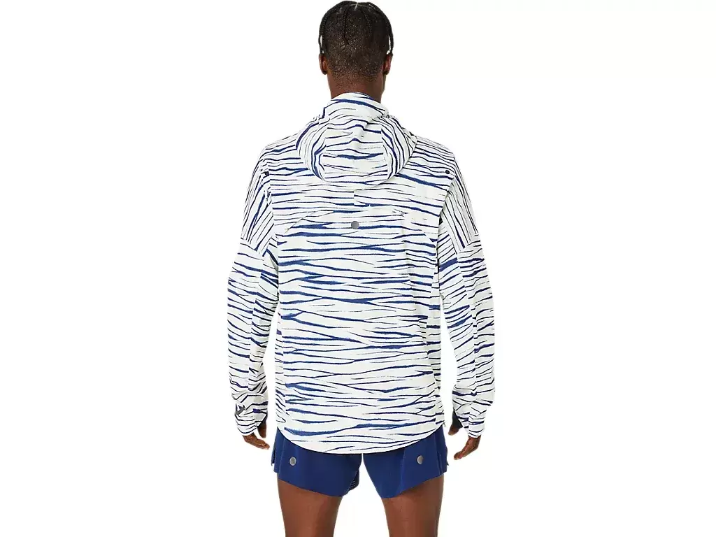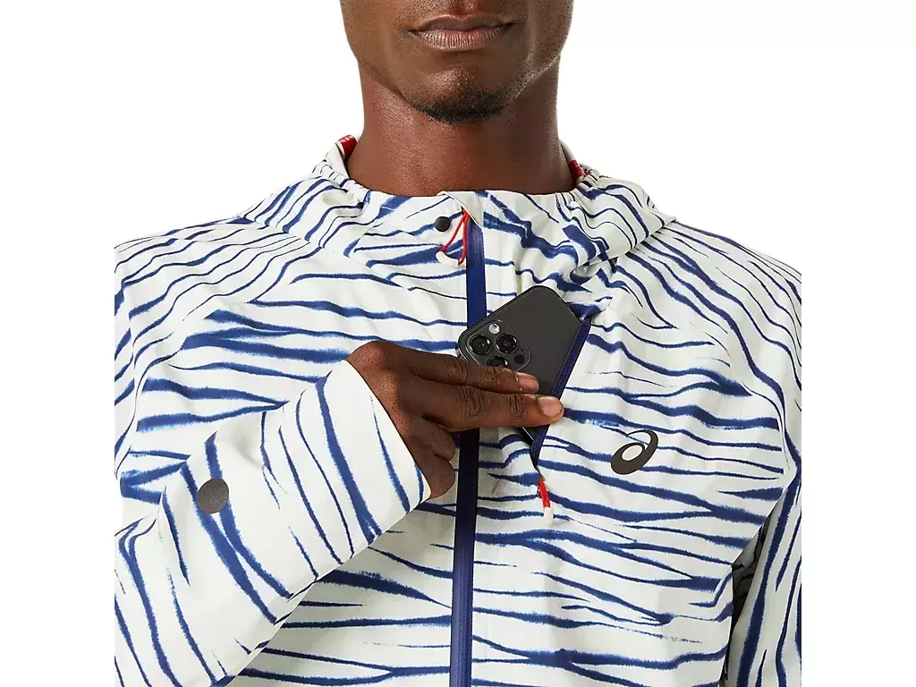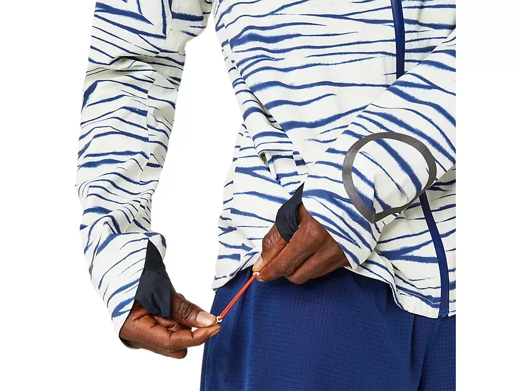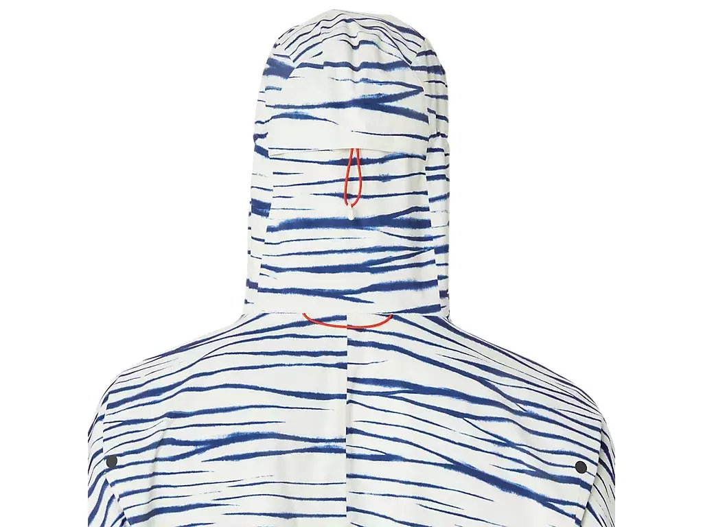 The METARUN™ SHIBORI WATERPROOF jacket is one of the most advanced jackets in the ASICS running collection. It’s functional when you’re running the elements and can be easily removed and packed into the chest pocket during your run.The jacket features a graphic inspired by Shibori, traditional Japanese dyeing techniques.This jacket has a fully waterproof construction, is lightweight and breathable. The jacket features thumbholes and an adjustable hood with integrated visor.Its ergonomic design and drop shoulder construction improve freedom of movement.There’s also a fit adjustment cord on the hem that helps keep the jacket in place when you’re in motion.At least 50% of the garment’s main material is made with recycled polyester to reduce waste and carbon emissions.