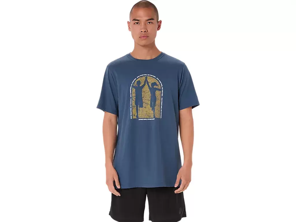This comfortable knit short sleeve tee acknowledges the importance of world mental health. The front graphic features two runners joining hands and the phrase, “”RUN TOGETHER, GO FURTHER”” circulating the center design.