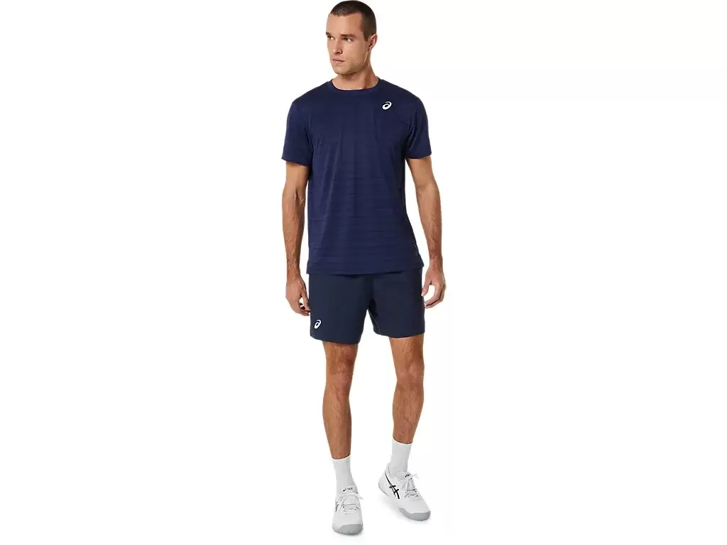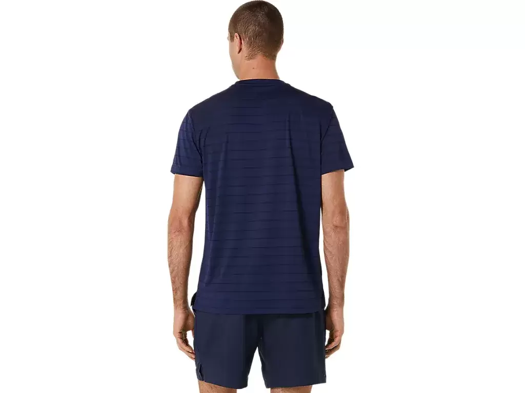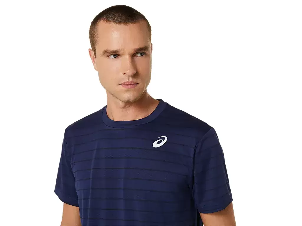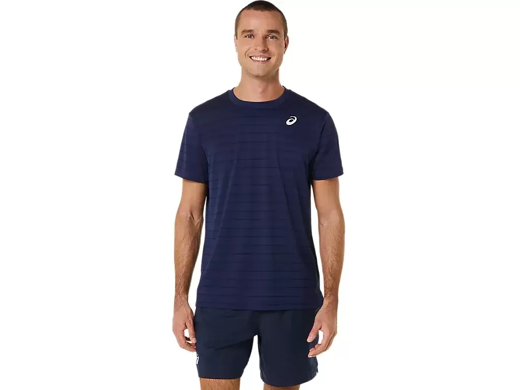 The COURT STRIPE SHORT SLEEVE TOP is designed with a fun tennis court graphic on the front.