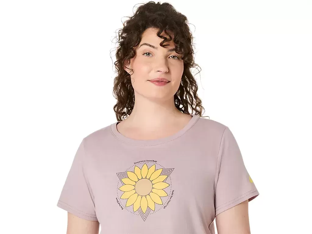This comfortable knit short sleeve tee features a crop top design that’s accented with a sunflower graphic on the chest.